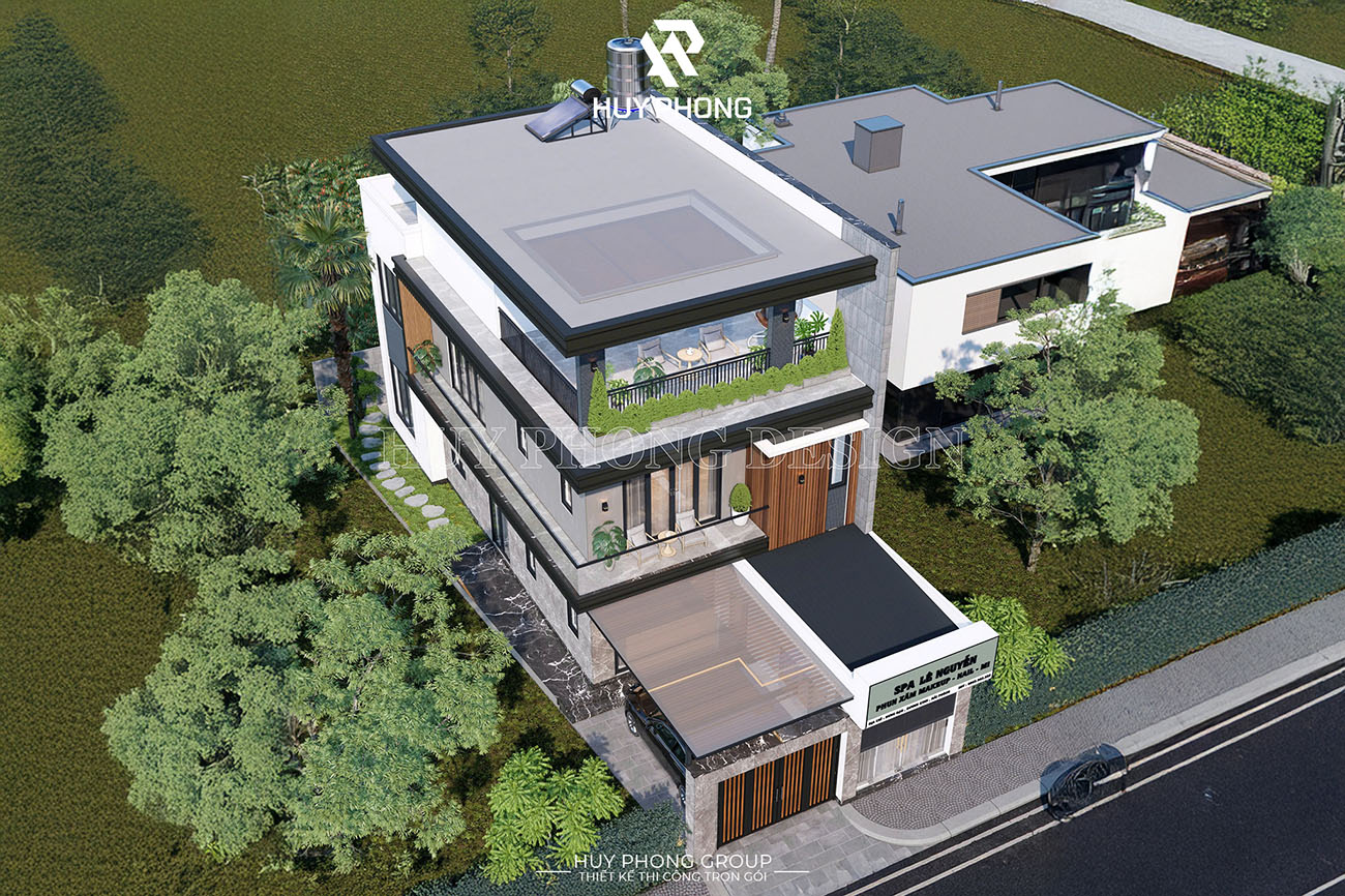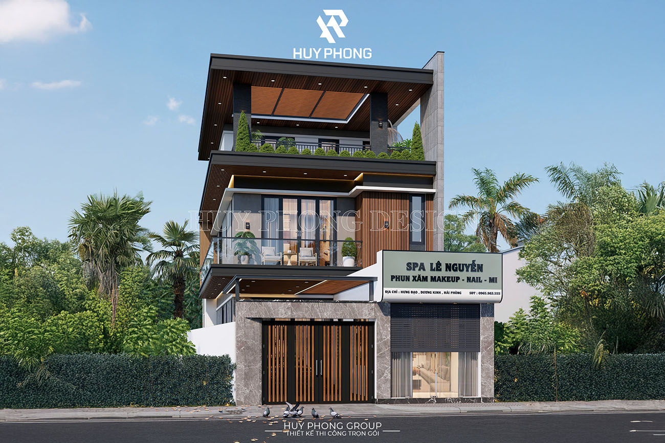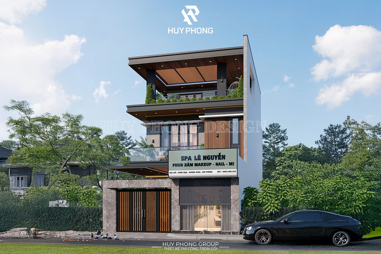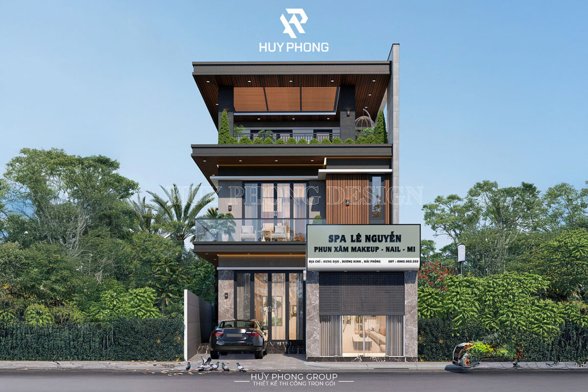 Công trình nổi bật với hình khối kiến trúc hiện đại, mặt tiền rộng thoáng với hệ cửa kính lớn, ban công xanh mát và gam màu trang nhã. Tầng 1 được thiết kế linh hoạt cho mục đích kinh doanh, vừa thuận tiện đón khách, vừa tạo sự riêng tư cho không gian sống bên trên.