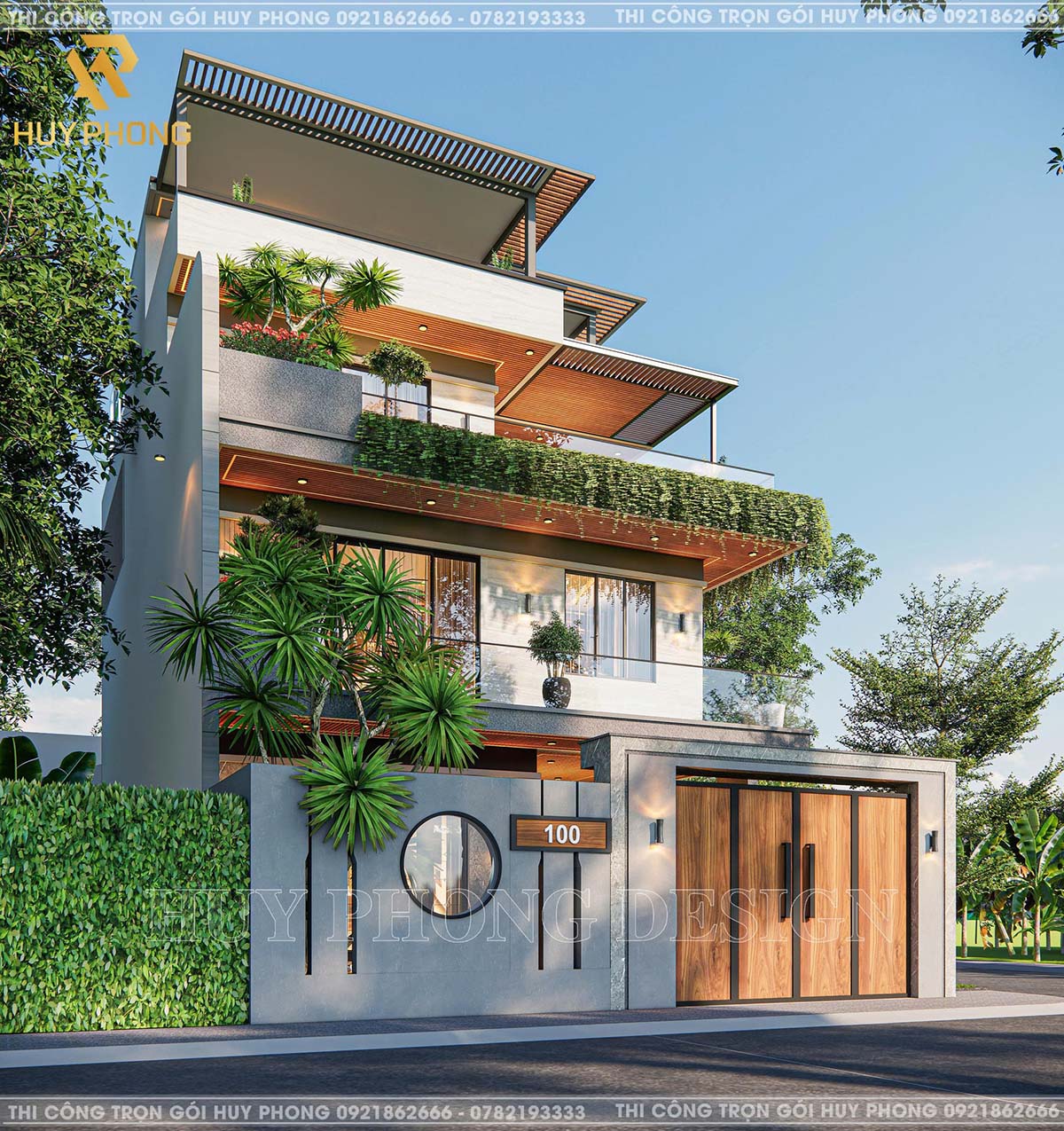 Công trình gây ấn tượng với những đường nét kiến trúc hiện đại, hình khối mạnh mẽ nhưng thanh thoát. Không gian mở được khai thác tối đa qua hệ cửa kính cường lực lớn, ban công xanh và khoảng sân thoáng, mang lại sự kết nối hài hòa giữa con người và thiên nhiên.